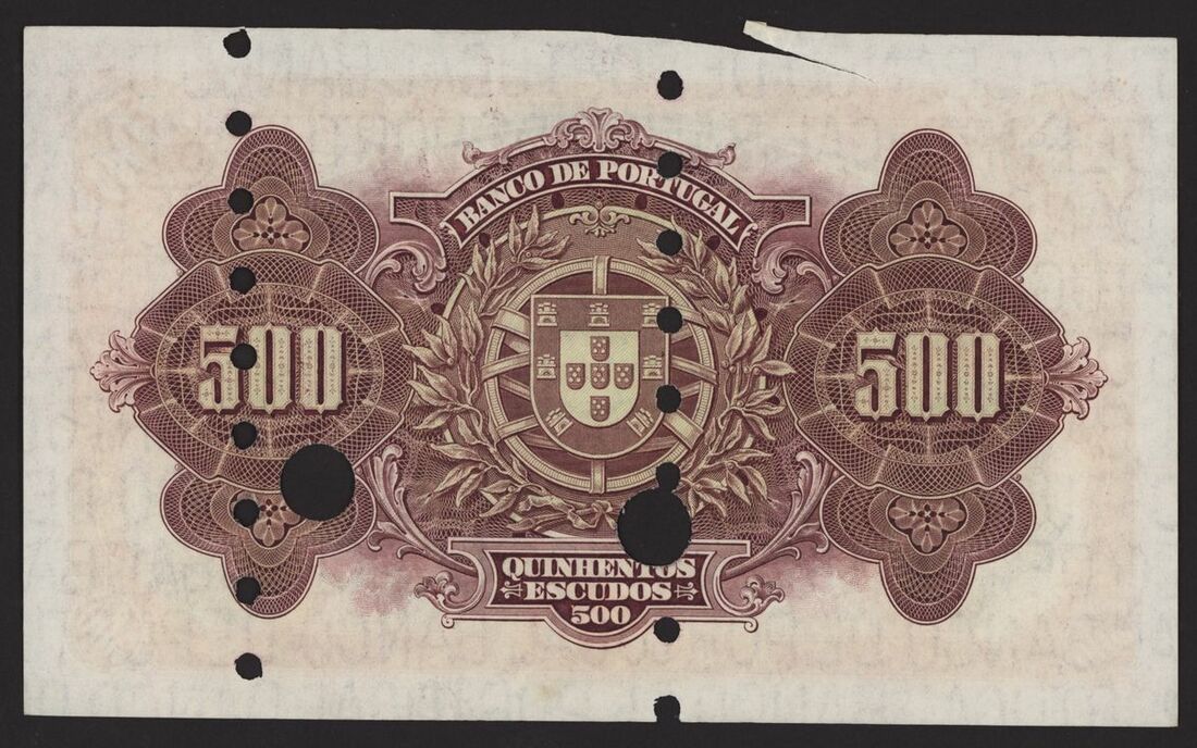 Banco de Portugal, Reis Spurious Issue, 500 escudos, 17 November 1922, Ch 2, red serial number 1L 10064, purple, pale yellow and green, Vasco de Gama at left, galleons right centre, reverse purple, arms at centre, value at left and right
