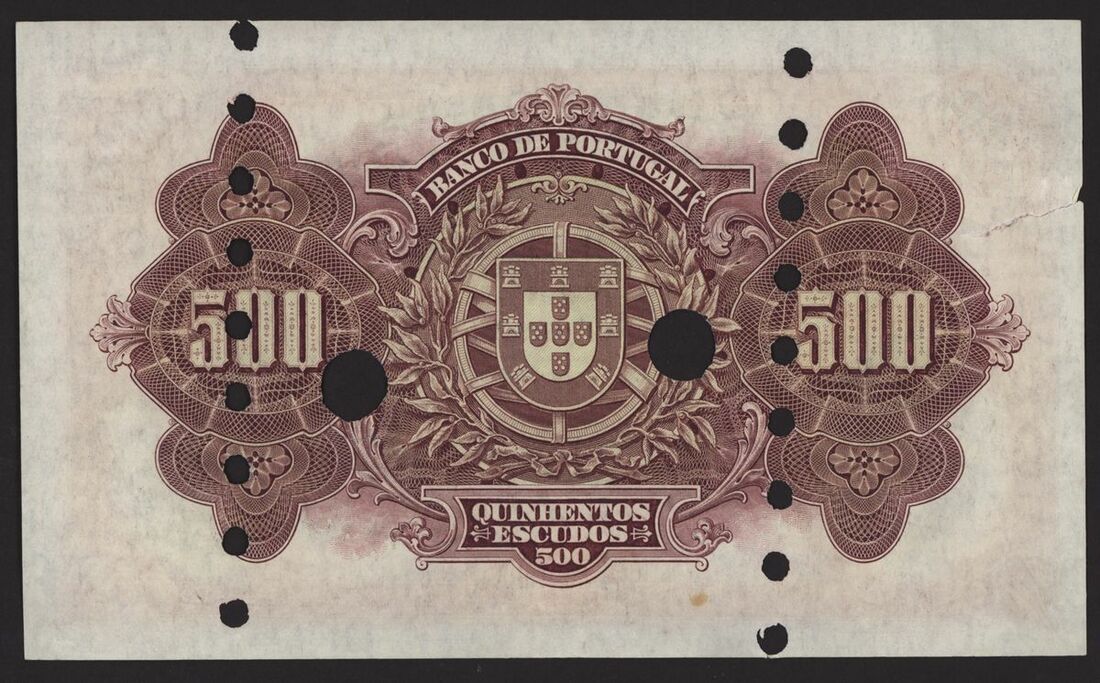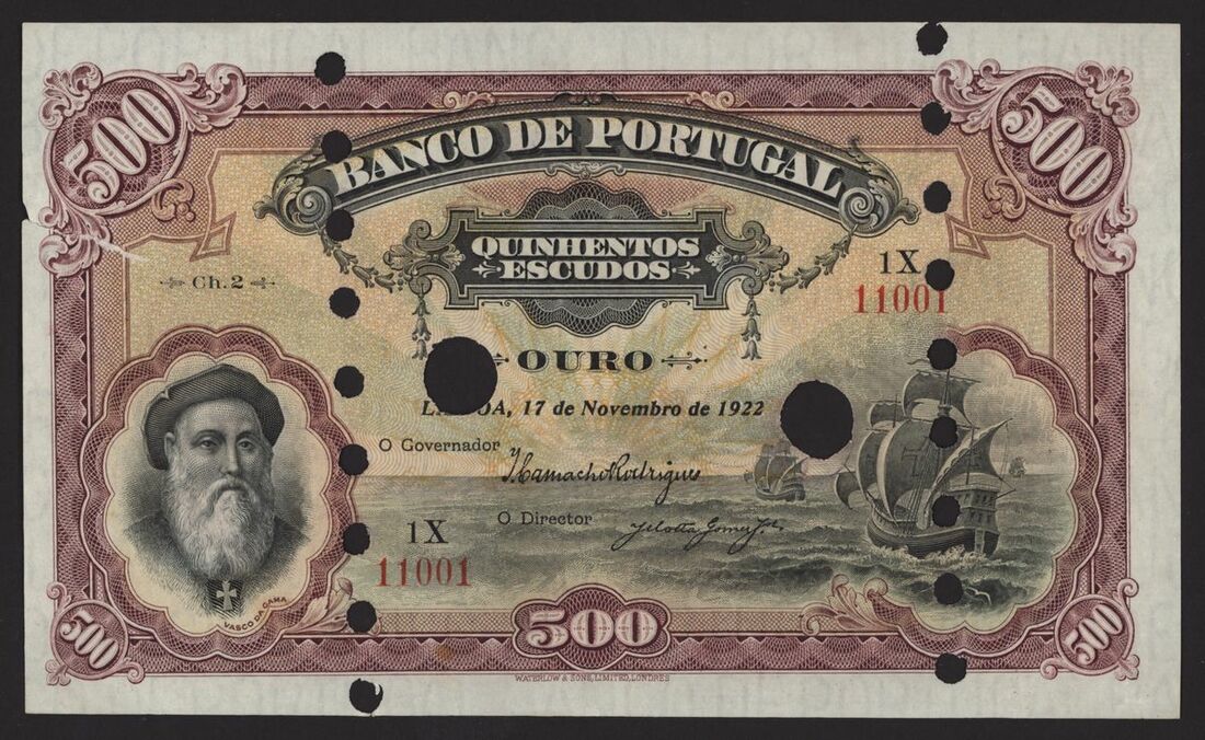 Banco de Portugal, Reis Spurious Issue, 500 escudos, 17 November 1922, Ch 2, red serial number 1X 11001, purple, pale yellow and green, Vasco de Gama at left, galleons right centre, reverse purple, arms at centre, value at left and right