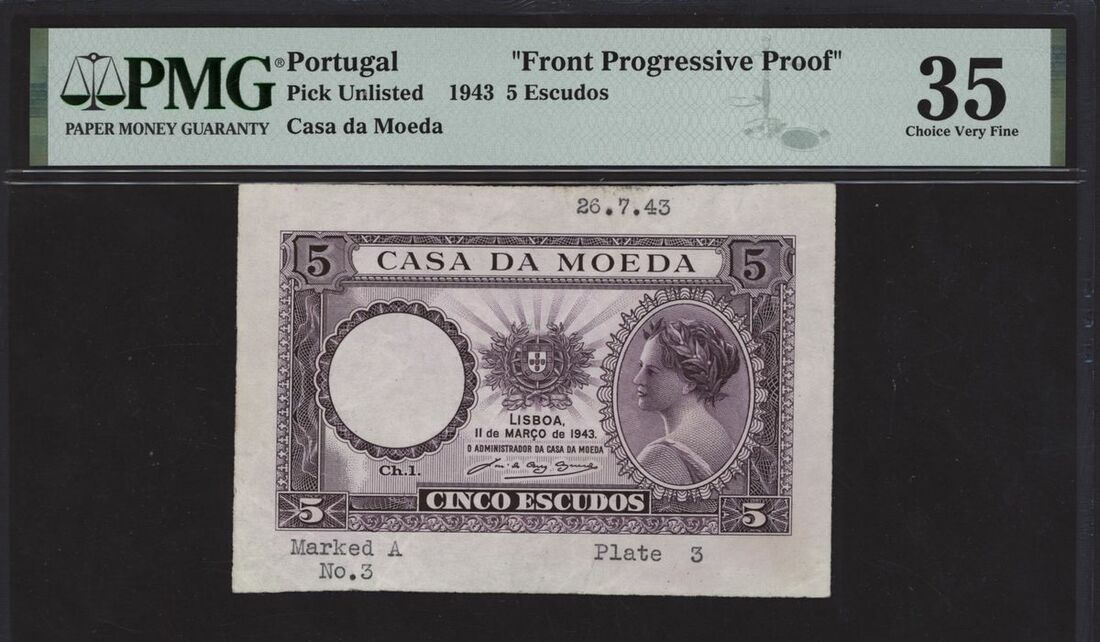 (x) Casa de Moeda, (Portugal), a printers archival die proof 5 escudos, 11th March 1943, Ch.1, no serial numbers, violet and white, maiden at right, arms at centre, value at each corner