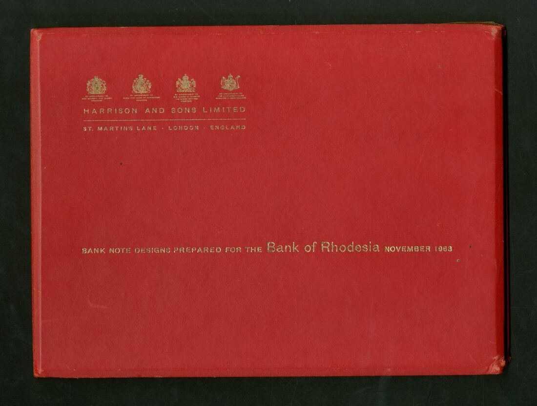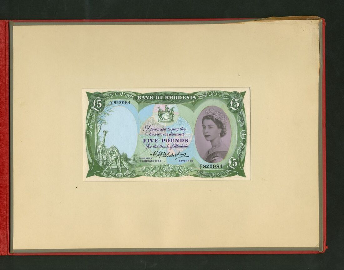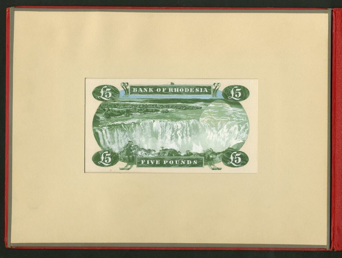 Bank of Rhodesia, Harrison & Sons pair of unissued design obverse & reverse essays £5, 16th January 1964, serial number Y/8 822984, (Pick unlisted), in presentation folder dated November 1963, highly unusual in a red folder, striking and visually appealing, there are no banknotes issued for Bank of Rhodesia, unique