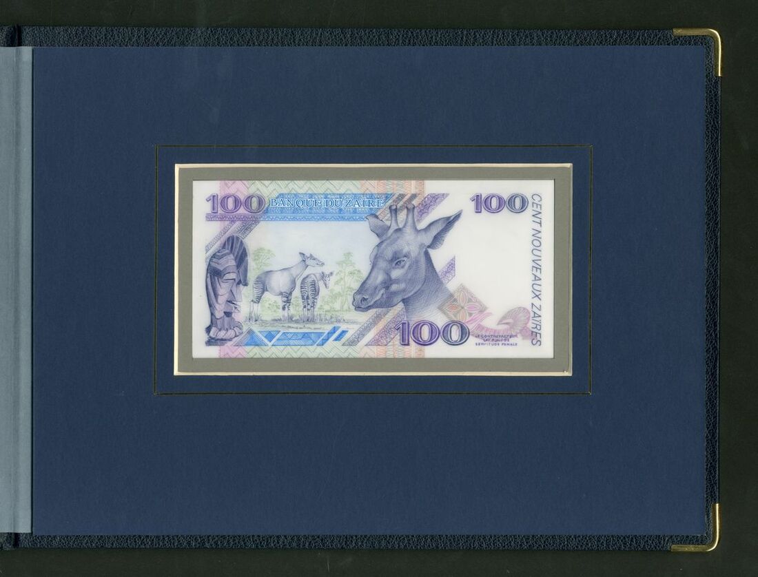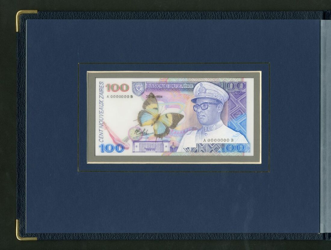 Banque du Zaire, Harrison & Sons pair of obverse and reverse essays 100 noveaux zaires, 30th June 1994, serial number A 0000000B, (Pick unlisted), in presentation folder, unique