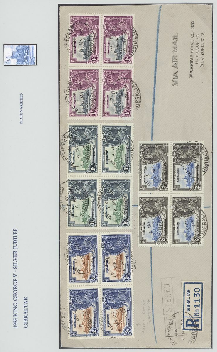 1936 (4 May) envelope air mail registered to USA bearing full set in blocks of four, the lower left stamp of the 3d. block showing variety short extra flagstaff, each cancelled by oval registered datestamp, a most appealing cover. S.G. 115b (£400 as a used stamp).