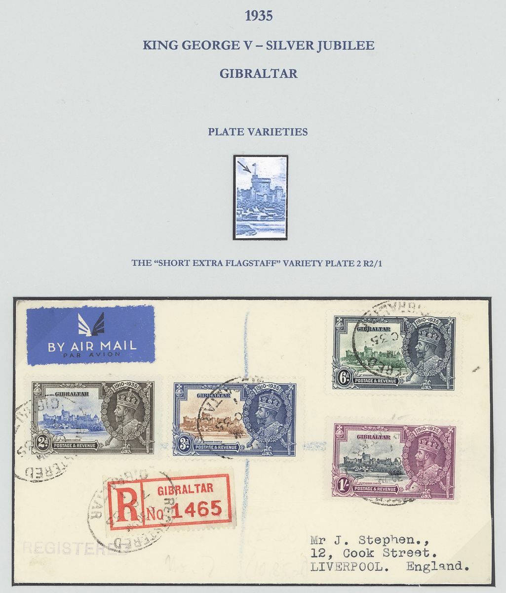 1935 (7 Oct.) envelope air mail registered to England bearing full set, the 3d. showing variety short extra flagstaff, each cancelled by oval registered datestamp, a scarce variety on cover and 1935 (22 Nov.) envelope air mail to England bearing 2d. and 1931-33 1d. the 2d. showing variety extra flagstaff, each cancelled by datestamp, envelope with horizontal fold far from the adhesives, S.G. 115b