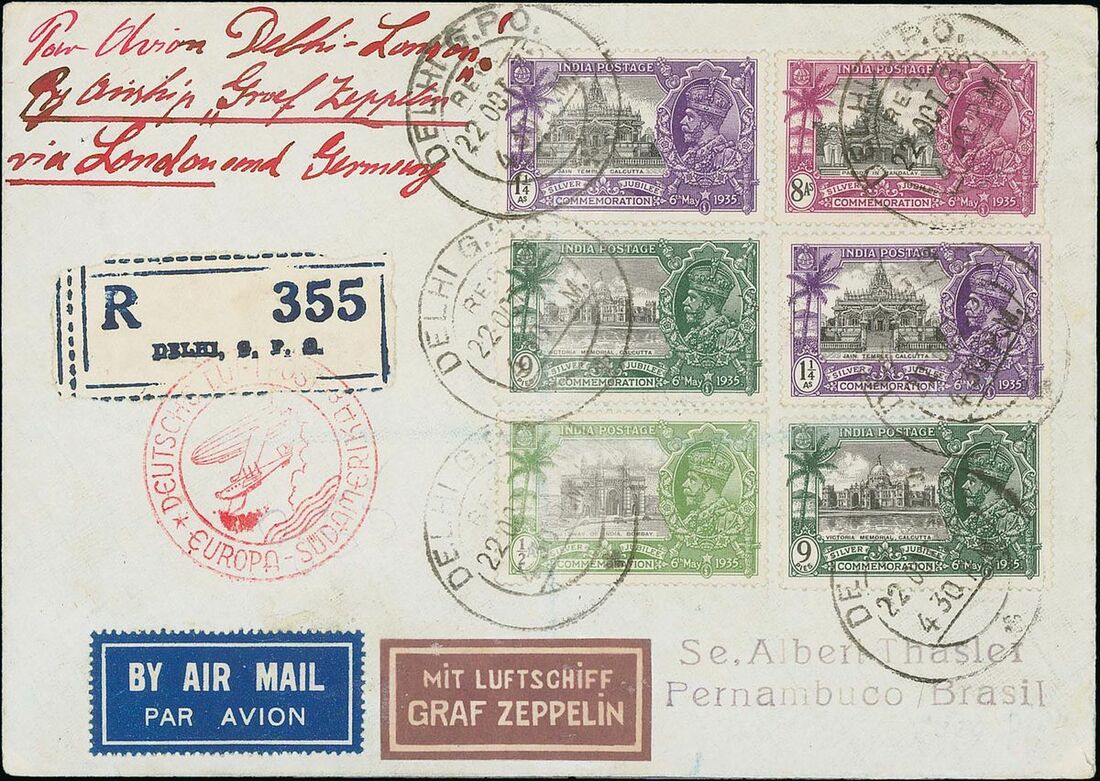 1935 (22 Oct.) envelope registered "Par Avion Delhi-London By Airship Graf Zeppelin via London and Germany" to Pernambuco, Brazil, bearing ½a., 9p. (2), 1¼a. (2) and 8a. cancelled with double-ring datestamps and with registration label tied by "