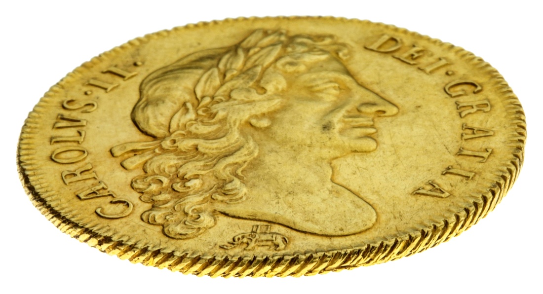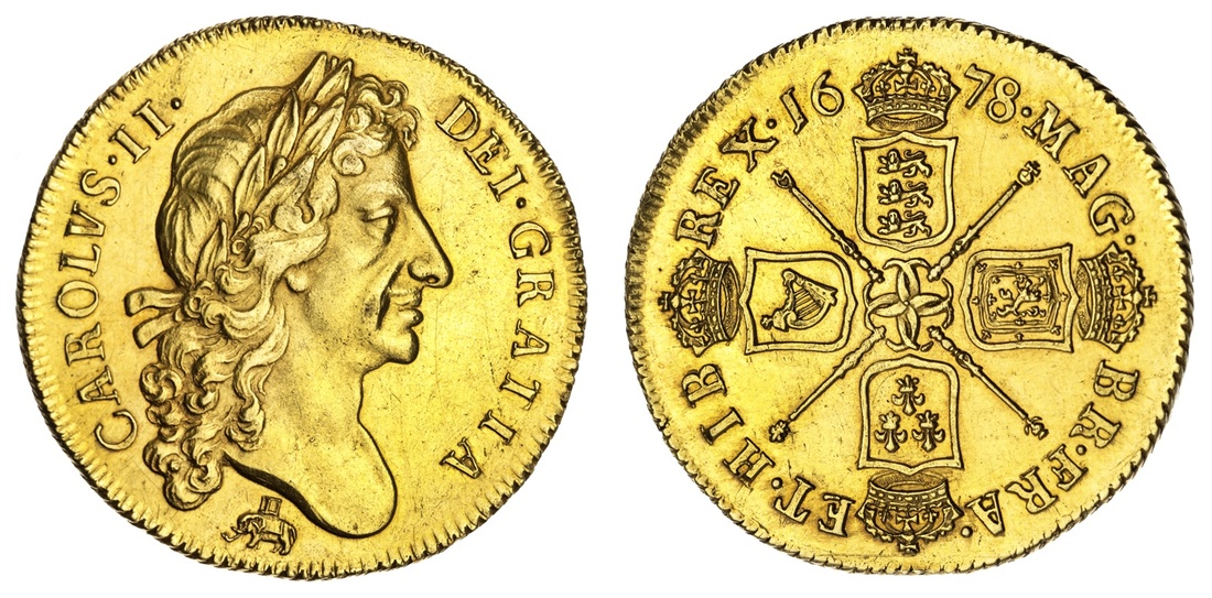 Charles II (1660-1685), 'Royal African Company' Two-Guineas, 1678, Elephant and Castle, second laureate head facing right, elephant and castle below, rev. crowned cruciform shields, crowns with frosted inner rings, five strings to harp, sceptres in angles, interlinked C's at centre, edge obliquely milled, 16.69g [258.0grns], 5h (MCE 41; EGC 214-215; Spink 3336), lightly cleaned in antiquity, otherwise lustrous with hints of reddish-orange tone in recesses, an exceptionally uniform and bold striking of this notoriously soft issue, about extremely fine, very rare in this attractive high grade, in NGC 'St Helier' holder, graded UNC Details ~ Cleaned (Cert. #6684100-002)