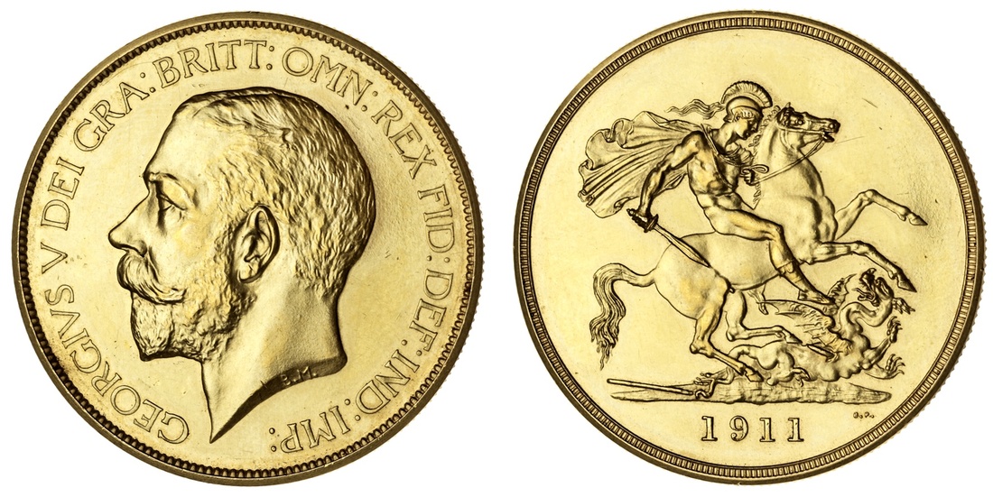 (g) NGC PF61 | George V (1910-1936), Coronation Specimen Proof Five-Pounds, 1911, by Mackennal and Pistrucci, bare head left, rev. St George and Dragon, edge milled, 39.92g [617.2grns], 1h (W&R 414; Stratos 207; Marsh F38; EGC 1430; Spink 3994), some cabinet friction and sporadic contact points in otherwise brilliant fields, a bold extremely fine, in NGC 'St Helier' holder (Cert. #6684100-001)