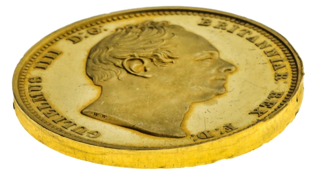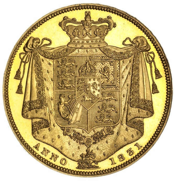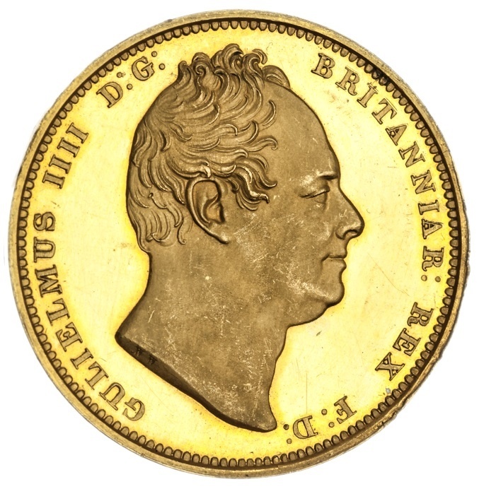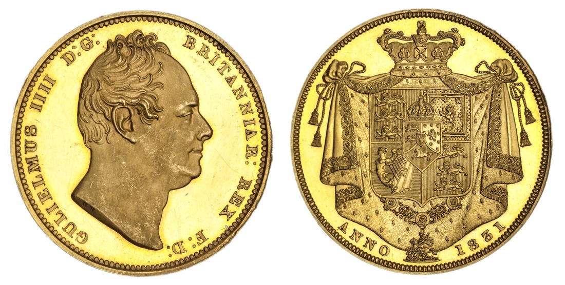 (g) NGC PF62 UCAM | William IV (1830-1837), Pattern Proof Two-Pounds, 1831, by W Wyon and Merlen, bare head right, rev. crowned shield in mantle, edge plain, 15.86g [245.2grns], 6h (W&R 258; Murdoch III, 438; King 206; Stratos 172; Marsh T20; EGC 1016; Spink 3828), a remarkably high relief striking with die capping to rims at 3 to 4 o'clock, nevertheless an extraordinarily beautiful coin, with nigh-flawless cameo frosting across Wyon's 'six week' portrait of the Sailor King in rich contrast to brilliant and subtly orange-tinged fields, a tiny die flaw at nape of neck in otherwise quite unblemished fields, practically FDC, a quite imperious coin!, in NGC 'St Helier' holder, conservatively graded PF62 ULTRA CAMEO (Cert. #6684100-006)