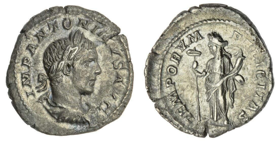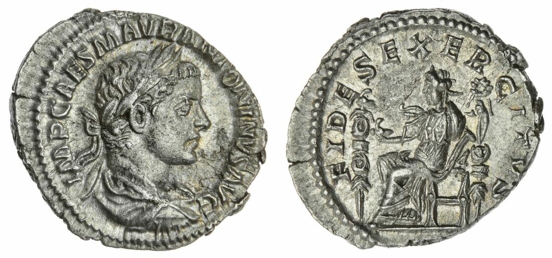 The Hanlon Collection | Roman Empire, Elagabalus, (AD218-222), (2): AR Denarius, Bust of Elagabalus, laureate, draped, right, IMP ANTONINVS AVG, rev Felicitas, draped, standing left, holding caduceus in right hand and cornucopiae in left hand, TEMPORVM FELICITAS, 2.37g, (RIC IV.2 150b) struck on broad flan, toned, flan cracks to edge, gVF (2); AR Denarius, 218-222AD, Bust of Elagabalus, laureate, draped, cuirassed, right, IMP CAES M AVR ANTONINVS AVG, rev Fides, draped, seated left, holding eagle in right hand and standard in left hand; before her, standard, 2.48g , (RIC IV.2 71d) Struck on misshapen flan, toned, EF (2).