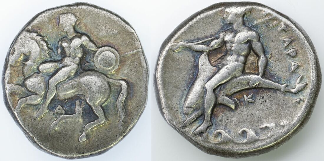 Calabria, Taras, AR Nomos, c.344-340 BC, Horseman holding shield and spear, about to dismount from horse galloping left,