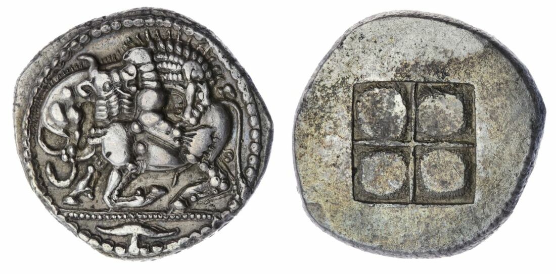 Further Coins from the Cabinet of Robert P. Ball, Macedon, Akanthos, 'The Sun, the Moon and the Circle of Life', AR Tetradrachm, c. 525-470 BC, Lion right attacking Bull left and biting into its rear, acanthus leaf below beaded exergual line, rev. quadripartite incuse square, 12h (Jameson I, 207/929; Desneux 72/46f; SNG Lockett 1281 these dies), a trace of softness to highest points, otherwise neatly struck and lightly toned, a wonderfully captivating if unsavoury depiction, perfectly struck, near extremely fine, very rare