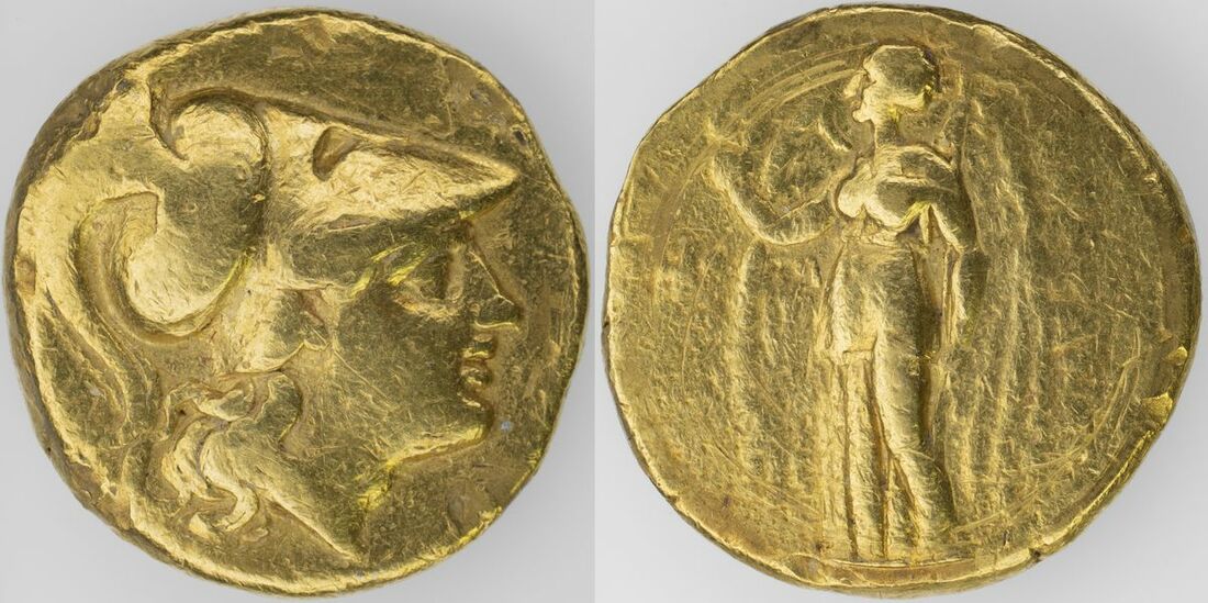 Kingdom of Macedon, Alexander III, 'The Great', (336-323BC) AV Stater, Head of Athena right wearing Corinthian helmet rev. Nike standing left, right hand outstretched, 8.34g (Price, --) circular scratches obscuring mint details, otherwise about good fine - ex Bruun Rasmussen, Auction 1509, lot 5000
