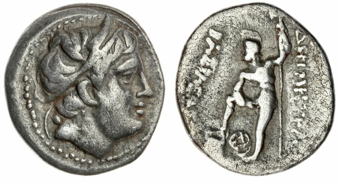 Kingdom of Macedon, Demetrios I Poliorketes, (306-283BC), AR Drachm, Diademed and horned head of Demetrios I right. rev. Poseidon Pelagaios, nude, standing left, foot propped on rock, holding trident and resting arm on leg, Monogram between legs, 4.05g, (Newell 154, pl. XVI, 9 (same obv. die); cf. SNG Alpha Bank 953 (tetradrachm)) well struck, in high relief, wear on reverse, very fine