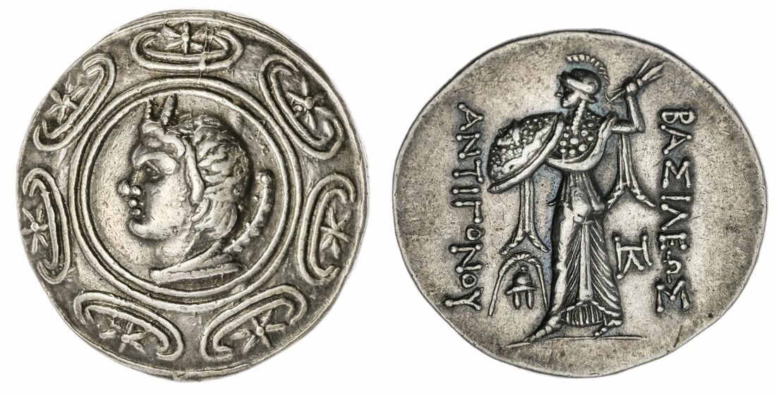The 'White Rose' Collection | Kingdom of Macedon, Antigonos II Gonatas (277/6-239 BC), AR Tetradrachm, Amphipolis, struck c. 271/68-260/55 BC, Horned head of Pan left, lagobolon over shoulder, in the center of a Macedonian shield rev.