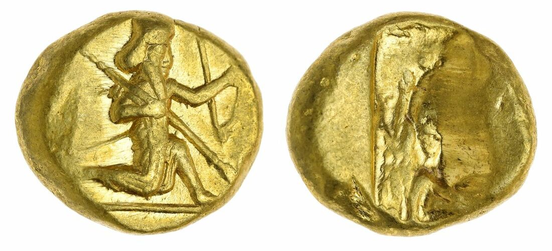 Persia, Achaemenid Empire, in the Time of Xerxes I to Darius II (c.485-420BC) AV Daric, Persian Great King or hero, wearing kidaris and kandys, in kneeling-running position on exergual line to right, holding spear and strung bow with quiver over shoulder rev. Rectangular incuse punch, 8.28g, (Carradice Type IIIb, group A/B (pl. XIII, 27); BMC Arabia, pl. XXIV, 26) slight wear to edges but residually lustrous and near very fine
