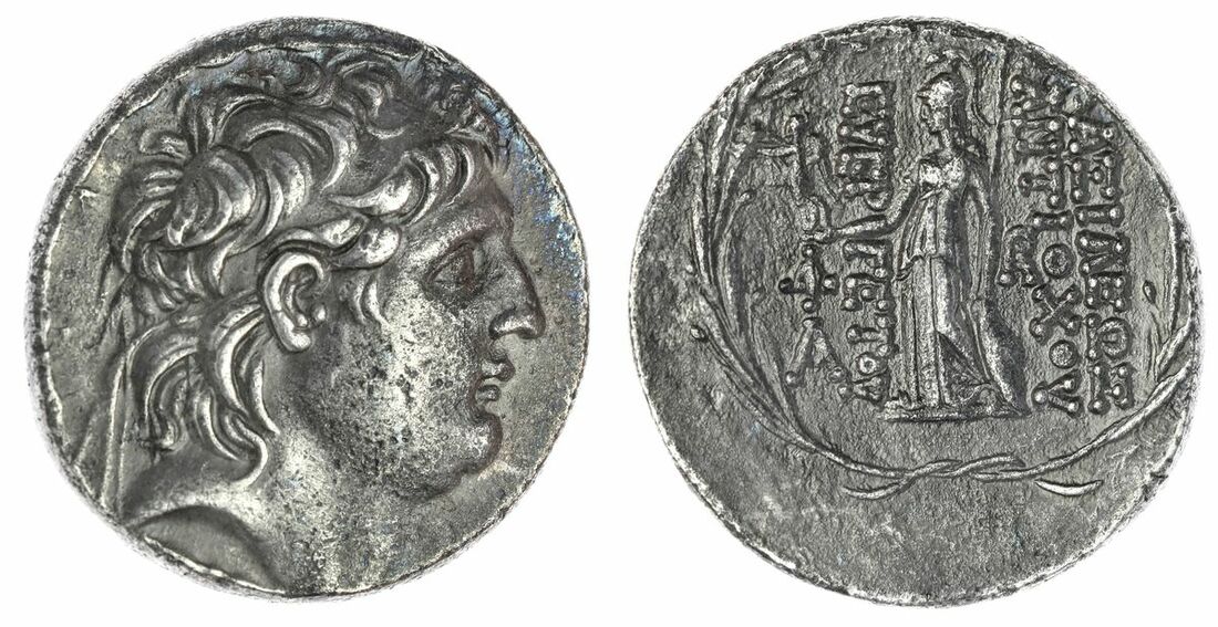 Seleukid Kingdom of Syria, Antiochos VII (178-129 BC) AR Tetradrachm, Antioch-on-the-Orontes, diademed head right rev. Athena Nikephoros standing left, resting hand on shield and propping spear on her arm, mint monogram above A to inner left, AP monogram to right, all within wreath, 16.05g, (SC, 2061.4d) detailed strike, attractive lustre, reverse above centre but otherwise good very fine