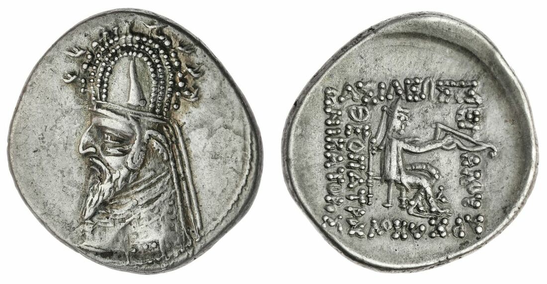 From Numista: 'The absence of both a clear reference to Sinatrukes in the extant Babylonian cuneiform material and tetradrachms from Seleukeia indicates that he never held Babylonia and had no access to its royal mint. With this in mind, we may safely assign S33 drachms to him, as this emission alone out of the fourteen different "Dark Age" types (S29-41 and S44) lacks parallel tetradrachms.'