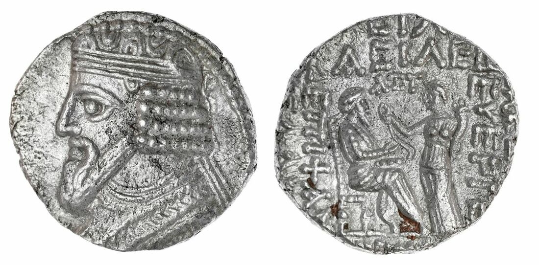Kingdom of Parthia, Gotarzes II (AD 40-51) AR Tetradrachm, Seleukia on the Tigris, dated SE 361/AD 50, Diademed and draped bust left rev. Tyche standing left, holding cornucopiae and wreath held out to Gotarzes seated right on throne; year above, month in exergue, 13.82g, (Sellwood, 65.25-27) Some porosity, oxidising on reverse, but otherwise well-struck, good fine