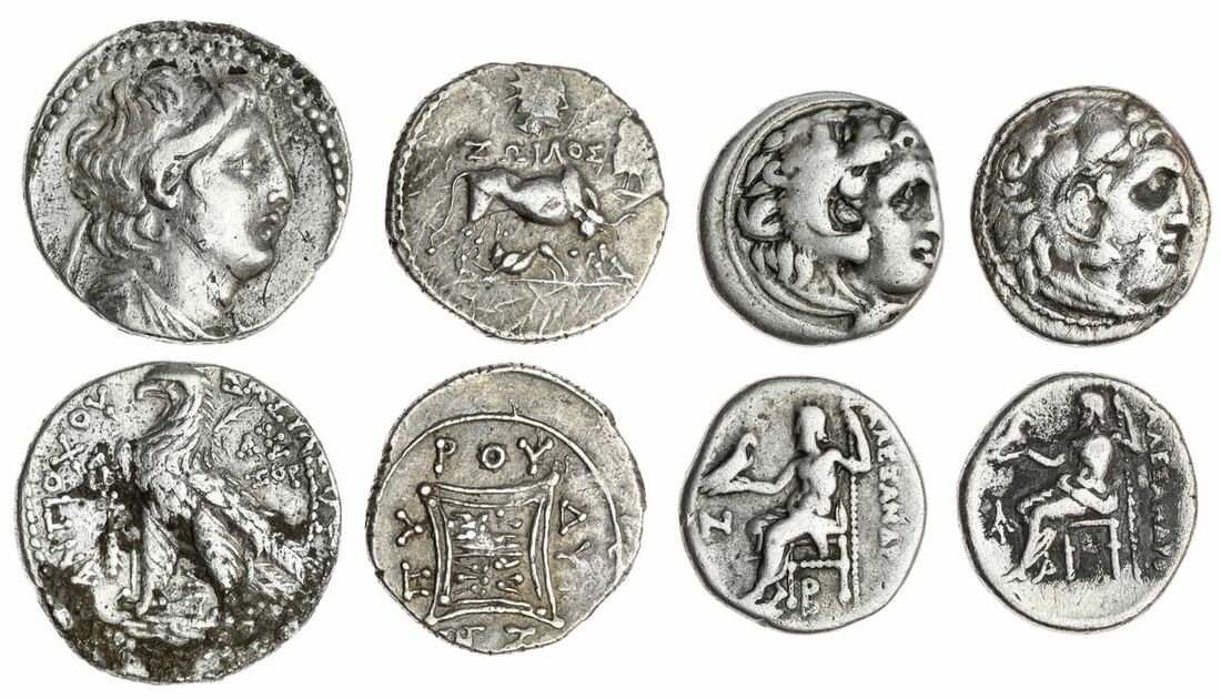 A Selection of Greek Silver (4): Kingdom of Macedon, Alexander III, 'The Great' (336-323 BC) AR Drachm (2): Each with head of Herakles clad in lions skin rev. Zeus Aetophoros enthroned left, holding sceptre in left hand, i) one with