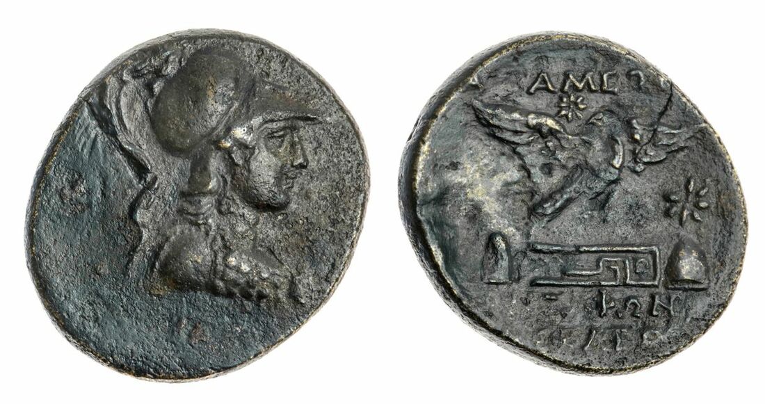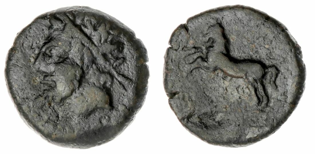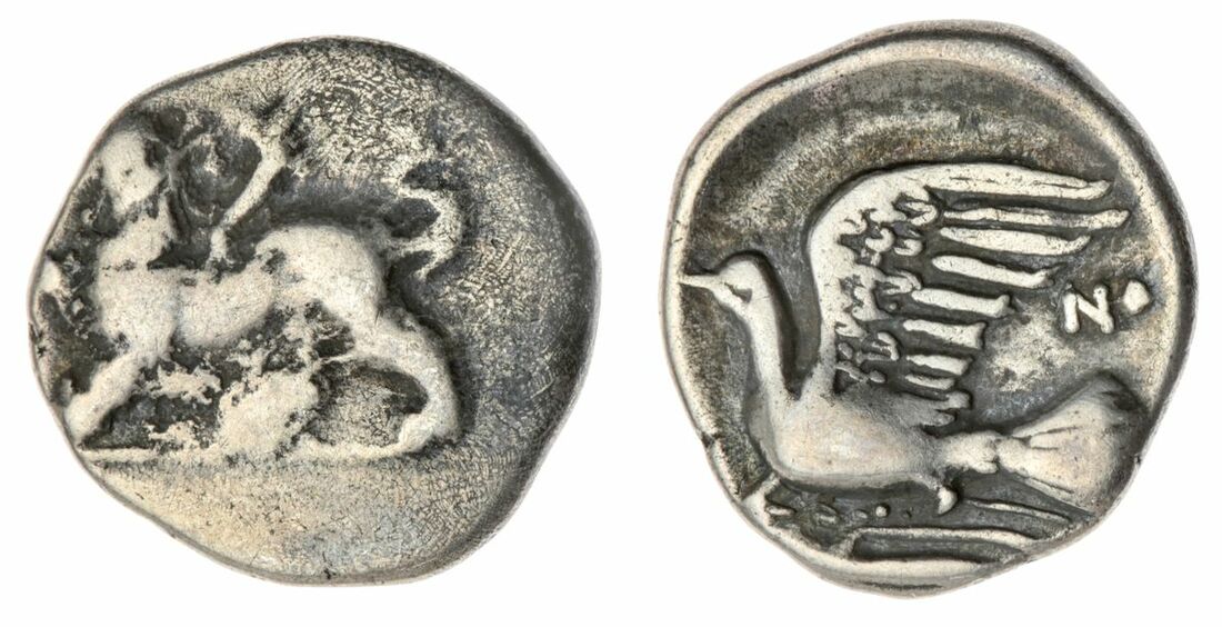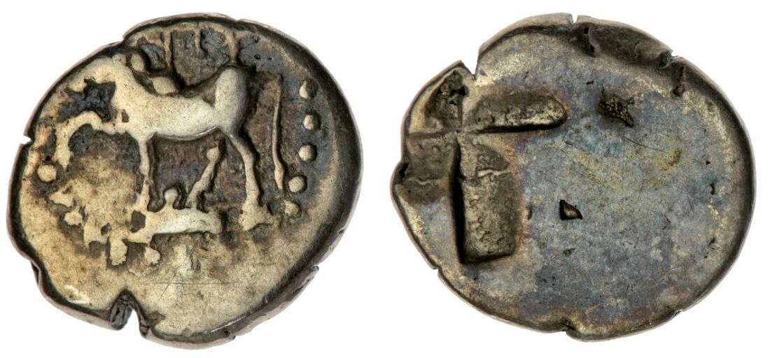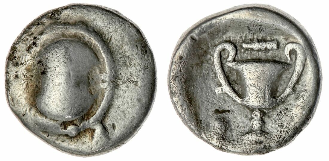 A Selection of Greek Bronze and Silver, (5): Thrace Byzantion, AR Tetrobol, 357-340BC, Cow standing to left, dolphin below, foreleg raised, rev. quadripartite incuse square of mill-sail pattern, 1.20g (S.1582; SNG BMC Black Sea 36-41 [Pl.II]) off-centre strike, fairly worn, Nice toning, good to fine; Boetia Federal Coinage, AR Hemidrachm, 395-340BC, Boetian shield, rev. Kantharos; above, club right; B-O across lower field; all within concave square, 2.48g, (variety unpublished in standard references) Cleaned, worn on obv, porosity to both surfaces of coin. good fine; Sikyonia AR Hemidrachm, C. 330-280BC, Chimaera advancing left, rev. Dove flying left, NA to right, all in shallow incuse circle, 2.53g, (BCD 284; SNG Copenhagen 57; BMC 11) Worn, Rev well struck, porosity on upper right quarter of obv, nearly very fine ; Phyrgia Apameia, Andronikos Alkios, Magistrate C. 100-50BC, AE 2, Helmeted bust of Athena wearing aegis right rev. below eagle flying right over maeander pattern; star above; caps of the Dioskouroi surmounted by star flanking. 8.68g, (BMC 46; SNG Copenhagen 164) Attractive dark brown patina, with some bronze showing through on high points, sharp details, with some flattening to the left side of the obverse. flan crack at two o'clock, nearly very fine; Numidia Micipsa, AE 14, 148-118BC, Laureate bust left, rev. Horse galloping left, 2.18g, (MAA 18a; Mazard 50; SNG Copenhagen 505) Dark brown patina, base metal showing on high points, Rare, good to fine (5)