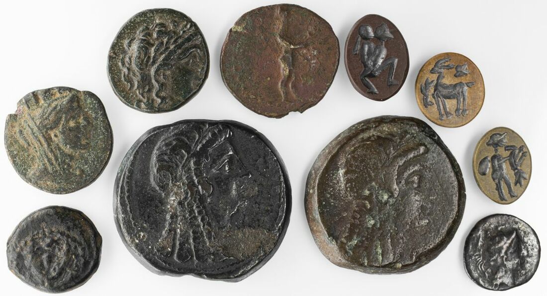 A Selection of Greek Bronze (7) and Intaglios (3): i) Seleukid AE, veiled head of Tyche right rev. eagle left with legend surrounding, 15.82g; ii) Another, Diademed head of Antiochos right rev. Tripod, 4.13g; ; iii) Ptolemaic AE in Seleukid style, as i) with Ptolemaic legend on reverse, 14.87g iv) Calabria, Tarentum AR Diobol, Head of Athena right rev. Herakles kneeling right, wrestling Nemean lion, 0.96g; v) Ionia, Miletos AE , Apollo Didymeus standing right, holding stag and bow, monogram to lower right rev. [M]ENESTPATOS, lion seated right, head left, star above, monogram to right, 3.34g; vi) Cilicia, Tarsos AE Veiled head of Tyche right rev. Standing standing right, holding flower above lion right, 3.37g; vii) Kingdom of Judea AE Half-Prutah, 1.97g; Intaglios (3): viii) Intaglio of dear standing left, bird to right above; ix) Another, of a couple embracing and kissing; x) Another, of a figure standing right blowing a horn, all three delightful and very fine; ranging from good to near very fine. Sold as Described, no returns. (10).