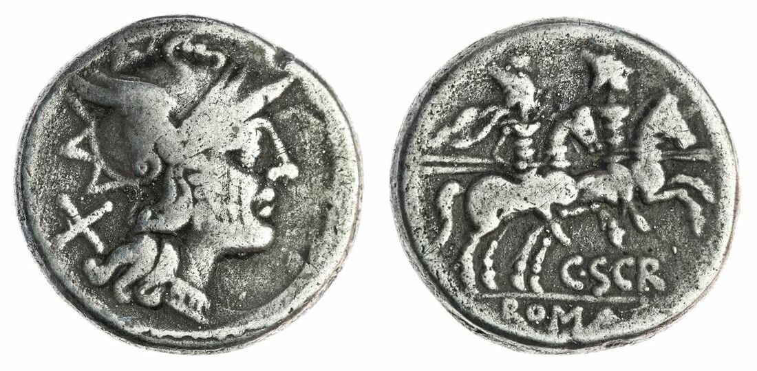 Roman Republic, C Scribonius AR Denarius, 154BC, Head of Roma right, wearing winged helmet, X behind, rev. the Dioscuri galloping right, C SCR below, ROMA in exergue, 7h, 3.27g, (Scribonia, 1; Crawford, 201; Sydenham, 380) softened at higher points, however residually lustrous, near good fine