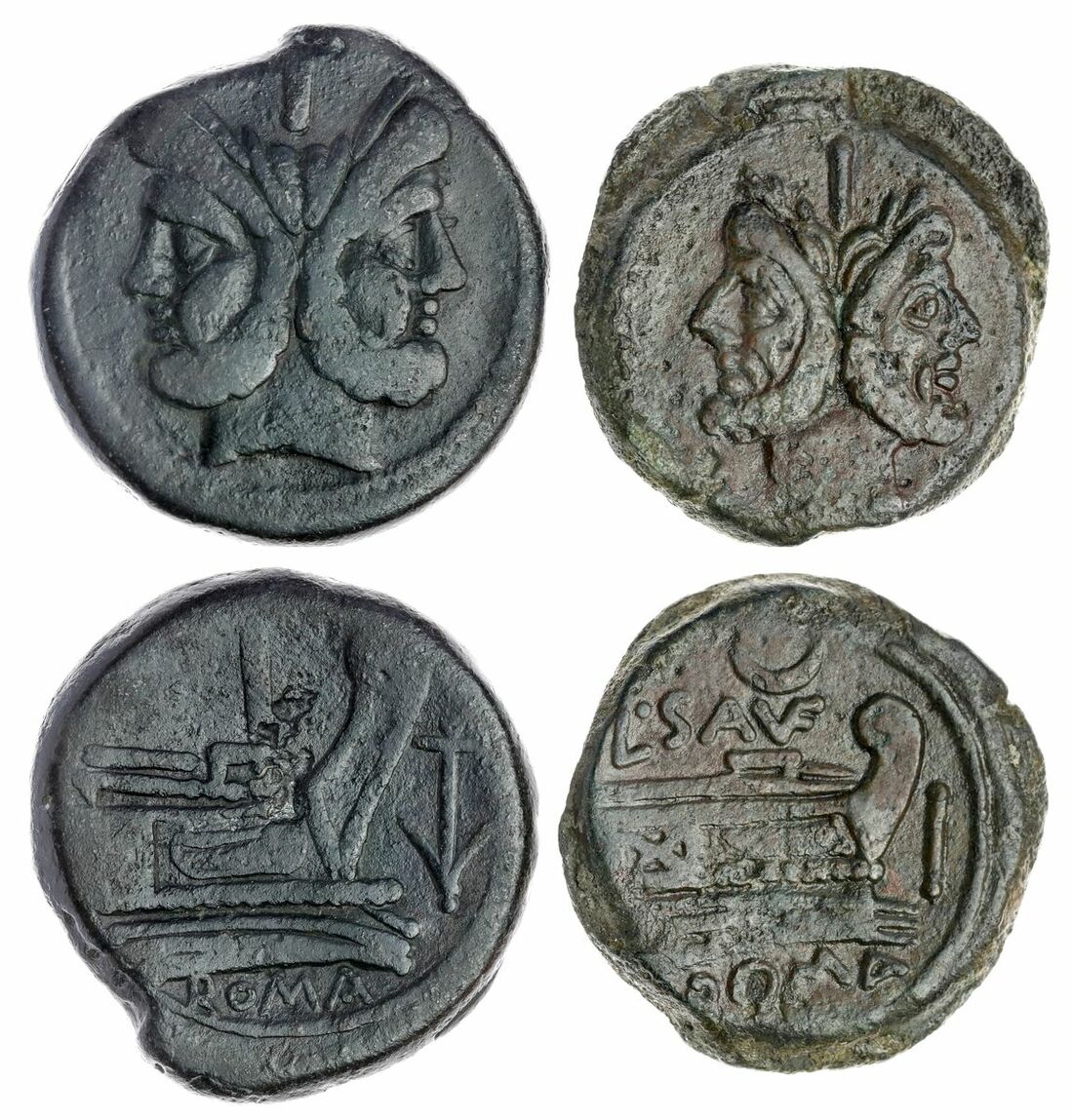Roman Republic (2): L. Saufeius AE As, 152BC, Laureate head of Janus, I (mark of value) above rev. Prow of galley to right, crescent and L•SAVF (partially ligate) above, I (mark of value) to right, ROMA in exergue, 2h, 24.63g, (Crawford, 204/2; Sydenham, 385; BMCRR Rome, 836) green patina, some porosity but otherwise good fine; Anonymous First anchor series AE As, 209-208BC, Laureate head of Janus, I (mark of value) above rev. Prow of galley right; I (mark of value) above, anchor before, ROMA in exergue, 7h, 36.54g (Crawford, 50/3; BMCRR Rome, 347; RBW, 187) softened, darkly-toned, good to fine, (2).