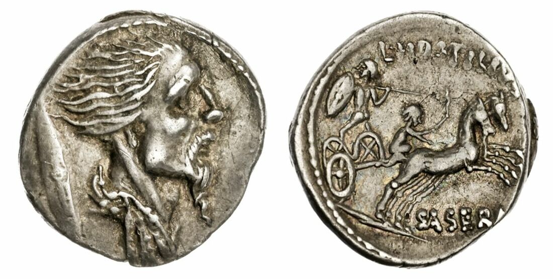 The 'White Rose' Collection | Roman Republic, L. Hostilius Saserna, AR Denarius, 48 BC, Head of Vercingetorix right, gallic shield behind, rev.