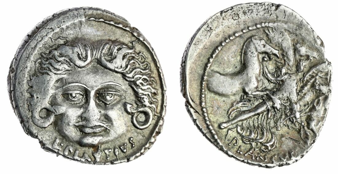 Roman Republic, L. Plautius Plancus AR Denarius, 47BC, Head of Medusa facing,
