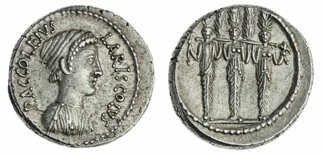 Roman Republic, P. Accoleius Laricolus, AR Denarius, c.43BC, Draped bust of Acca Larentia right, rev. Three statues of the Nymphae Querquetulanae standing facing, in front of supporting beam adorned with five trees, 3.89g, (Crwaford, 486/1; Sydenham, 1148) Lustrous, detailed, lightly toned, very light marking to the obverse but otherwise extremely fine