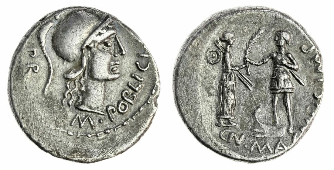 Roman Republic, Gnaeus Pompey, struck by M. Poblicius, legate, AR Denarius, Spain, c.42BC,