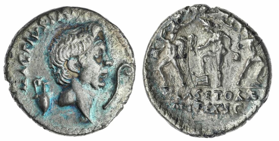 Roman Republic, Sextus Pompey Magnus, AR Denarius, 40BC, Bare head of Pompey the Great right between lituus and Capis, rev. Neptune left, foot on prow, between the brothers Anapias and Amphinomus, with their parents on their shoulders, 3.58g, (Crawford 511/31; Sydenham, 1344; RSC, 17 (Pompey the Great)) Wonderfully-toned, some scratches to reverse but very fine Ex. Cornelius C. Vermeule III Collection, CNG Auction 50, June 1999 (£440).