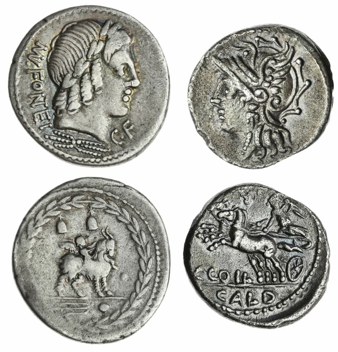 Roman Republic, (2): C. Coelius Caldus, AR Denarius, 104BC, Helmeted head of Roma to left rev. Victory driving biga left with control letter above,