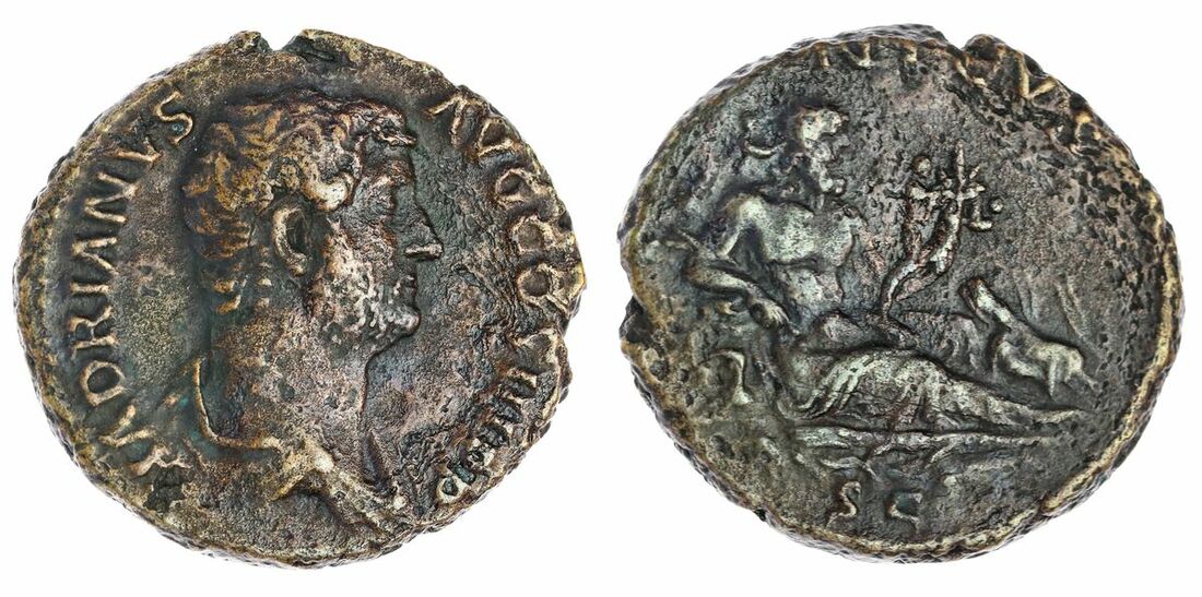 Roman Empire, Hadrian (AD117-134) AE As, Bare-headed, draped bust right rev. Nilus seated on river bank right, holding cornucopiae on which children climb, reeds and crocodile left in right field,