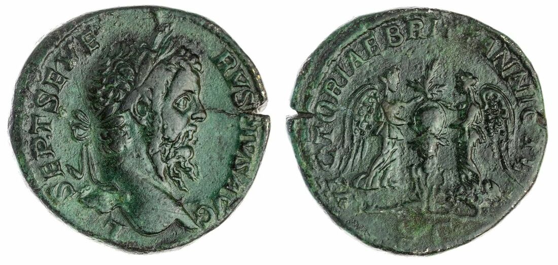 Roman Empire, Septimius Severus, AE Sestertius, Rome, 202-210, L SEPT SEVERVS PIVS AVG, laureate and diademed head right rev. VICTORIAE BRITTANNICAE, two Victories facing each other, fixing shield to a palm between them, two captives at foot; SC in exergue, 12h, 27.10g, (RIC IV 818) lustrous, green patina and handsome strike, softened at six o'clock but otherwise good fine, nearly very fine
