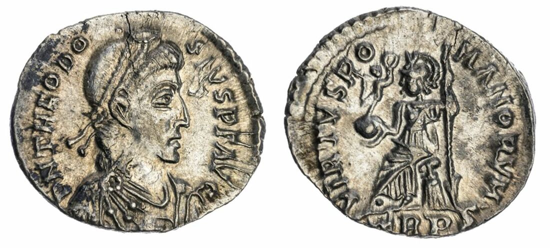 (x) The 'White Rose' Collection | Roman Empire, Theodosius I (379-395), AR Siliqua, Trier, pearl-diademed, draped and cuirassed bust right,