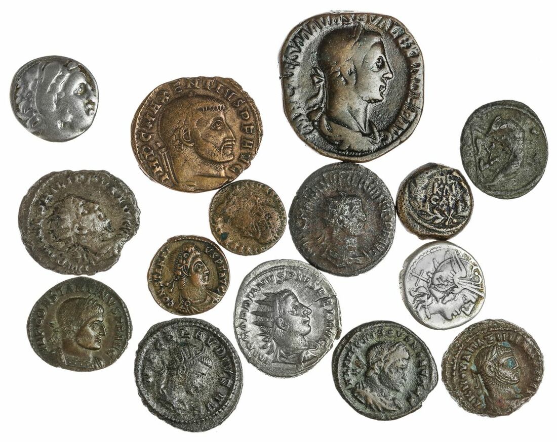 Selection of Ancient Coinage from the Roman Republic to the House of Constantine (15) Includes an Alexander III 'The Great' drachm; a C. Renius Denarius; a Severus Alexander Sestertius; a Gordian III Antoninianus; a Maxentius bronze Follis; a Diocletian provincial Tetradrachm and a Crispus AE 3; Ranging from good fine to very fine, a lovely general selection of ancient coins (15). Ex. Bruun Rasmussen Sale 920, lot 3000 17/05/2009; Sold as described, no returns.