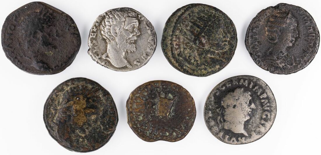 Roman Empire, a Selection of Bronze and Silver (7): including Vitellius, (AD 69), AR Denarius, Laureate bust right, rev. Tripod, surmounted with dolphin, raven stg. right below, 2.43g, (RIC 109 ; BMCRE 39 ; RSC 111) mottled toning, fairly worn, good fine; Clodius Albinus as Caesar (193-195) AR Denarius, bare head right rev. Fortuna seated left holding rudder and cornucopiae, 2.84g, (Cohen, 30; RIC, 5); A Selection of Bronze (5): Claudius, AE Quadrans,