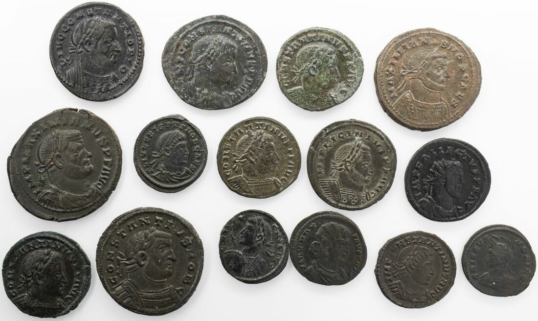 Roman Empire, Bronze and Billion of the Tetrarchy and House of Constantine (15): Maximian (2): i) AE Follis, Laureate, draped and cuirassed bust right rev. Genius standing left with patera and cornucopiae, 9.64g (RIC, 33) Some cracks at edge but otherwise good very fine; ii) another as before,10.46g, near extremely fine, lovely strike and tone; Licinius, iii) Another, as before with star to right field and