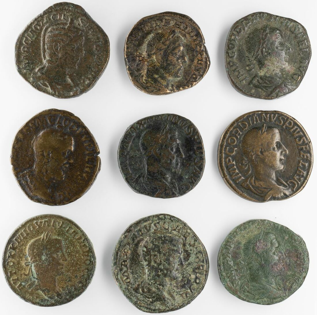 Roman Empire, Bronze of the Third Century (9): Maximinus I AE Sestertius, IMP MAXIMINVS PIVS AVG rev. SALVS AVGVSTI SC, 16.28g; Maximus, as Caesar AE Sestertius, MAXIMVS CAES GERM rev. PIETAS S C, 22.18g; Pupienus, AE Sestertius, IMP CAES M CLOD PVPIENVS AVG rev CONCORDIA AVGG, 15.48g; Gordian III (2): AE Sestertii, 19.32g; 18.94g(probably fake); Philip I, 'The Arab' (3): i) AE Sestertius, MILIARIUM SAECVLVM S. 13.30g; ii) AE Sestertius, IMP M IVL PHILIPPVS AVG rev. SAECVLVM NOVVM Roma standing facing in octastyle temple, SC in exergue, 20.39g; iii) AE 30, Antioch, AVTOK K MA IOLAI PHILIPPOS SEV rev. Veiled and turreted head of Tyche right, Ram running right above, 20.18g; Otacilia Severa, Wife of Philip I, 'The Arab', AE Sestertius, MARCIA OTACIL SEVERA AVG rev. CONCORDIA AVGG Concordia standing left holding patera and double cornucopiae, 19.38g; ranging from good to very fine, a selection of the tumultuous year of the six emperors, some considerably scarce in bronze