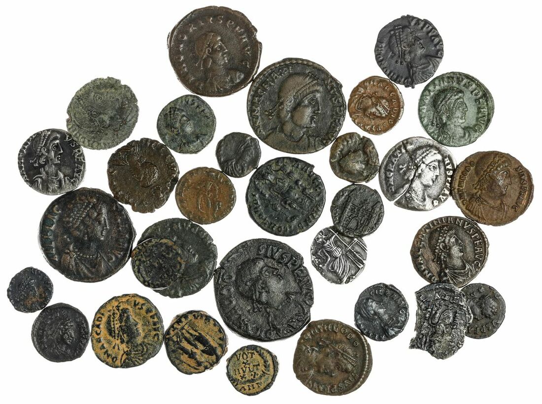 Roman Empire, Coins of the Decline and Fall, AD367-474 (31): Gratian AR Siliaque (4); Valentinian II (2): AE 3 (2); Theodosius I (7): Including an AR Siliqua; an AE 4 of Antioch; an AE 4 of Heraclea; and an AE 2 of Heraclea, (7); Aelia Flacilla (2): AE 4 and AE 2 (2); Magnus Maximus, (2): AE 4 and AE 2, (2); Arcadius (4): AE 3, AE4; AE4 of Antioch and AR Siliqua, (4); Eudoxia, Wife of Arcadius, AE 3 of Nicomedia; Honorius (4): AE 3 of Antioch; Another, of Constantinople; AE 4 of Antioch; and an AE 2; (4); Theodosius II (3); AE 4 and AE 3 of Nicomedia; AE 4, (3); Valentinian III AE 4; Marcian, AE 4; ranging from good to very fine, (31). Sold as described, no returns.