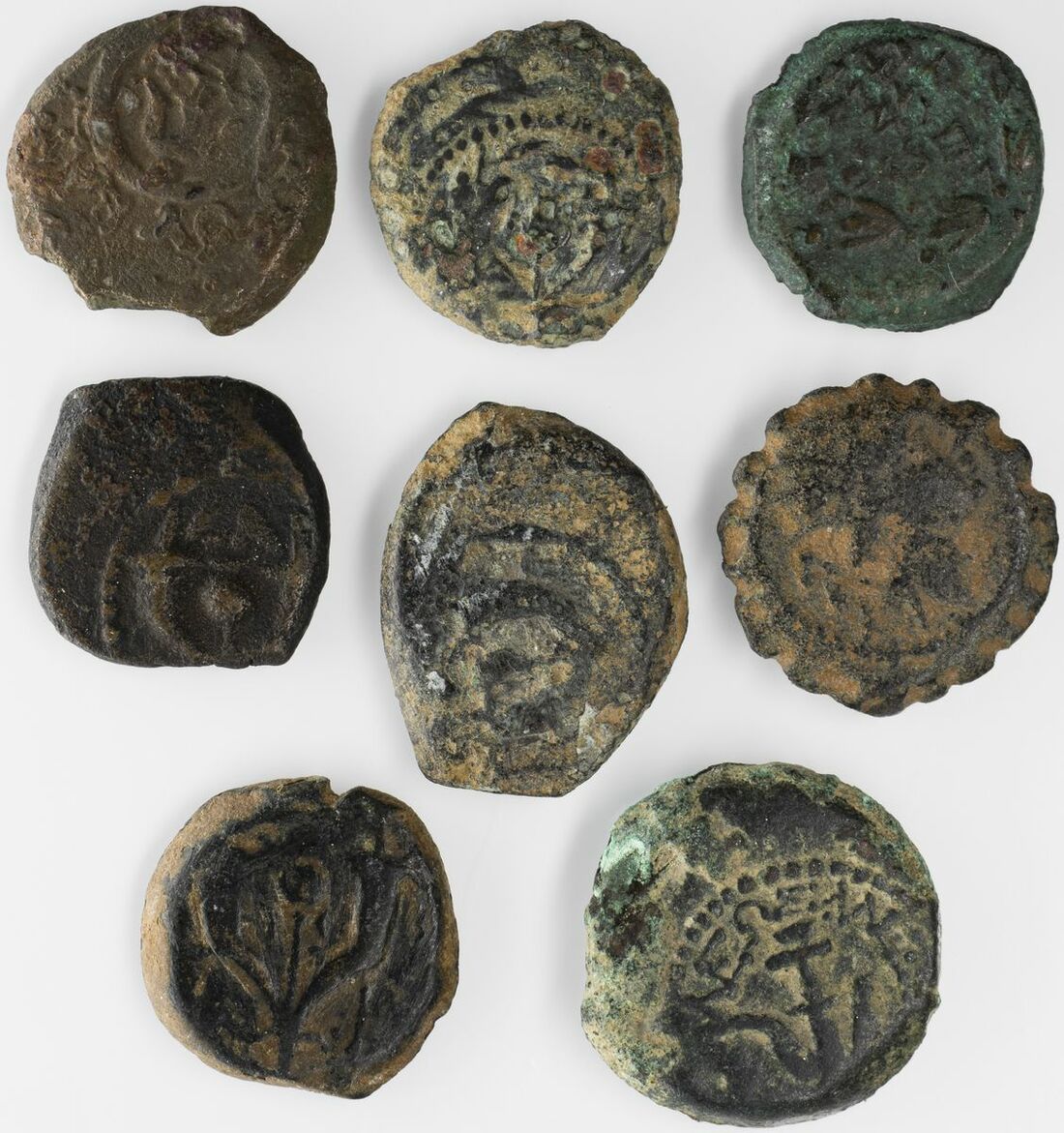 Judea, Coins of the Hasmoneans and Seleukids (8): Alexander Jannaeus, (103-76 BC) (7): i) AE Prutah Double cornucopia with pomegranate between the horns rev. Legend within wreath, 1.56g, (Hendin, 1144) green patina, off-centre but well-struck, good fine; ii) another, 1.56g, (Hendin, 1149) nicely-struck, light-brown patina, about very fine; iii) another, 1.48g, (Hendin, 1149) lamentably worn, good to fine; iv) one more, 1.27g (Hendin, 1149) reasonably detailed with light patina but considerably off-centre, good fine to very fine; v) AE Prutah, legend in crude paleo-Hebrew between pellet-like rays of a star, monogram included, rev.