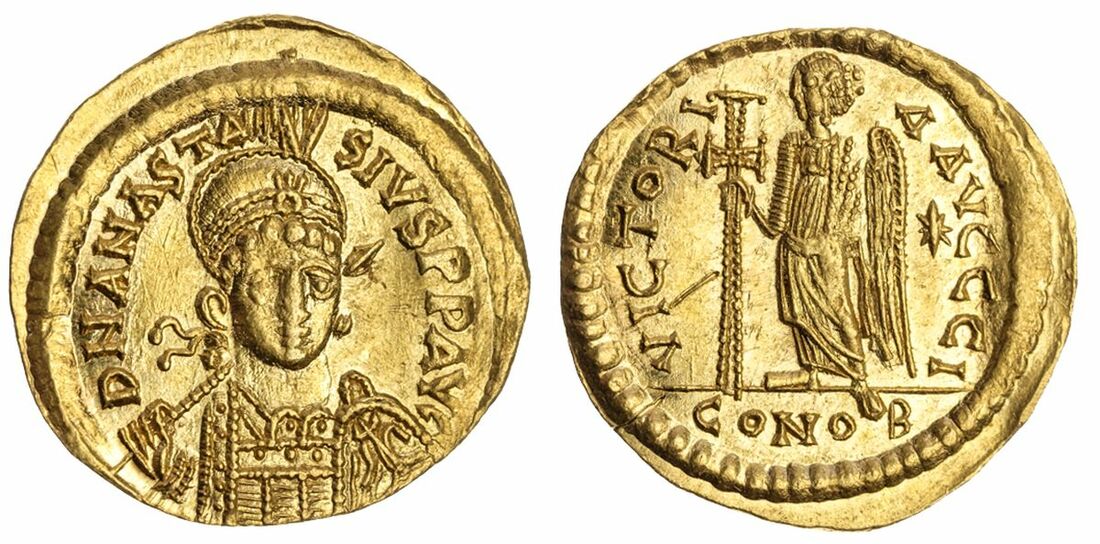 (x) The 'White Rose' Collection | Byzantine Empire, Anastasius I (491-518), AV Solidus, Constantinople, armoured bust facing, wearing pearl-diademed helmet and holding spear over shoulder,