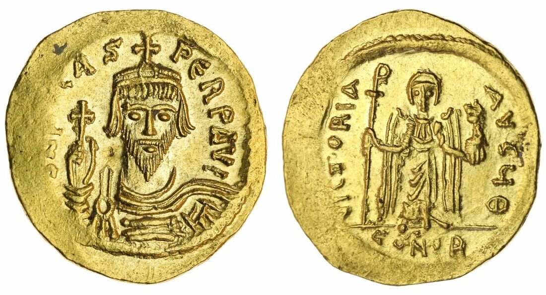 Byzantine Empire, Phokas (602-610) AV Solidus, Constantinople, 9th Officina, c.607-610, AS PERP AVI draped and cuirassed bust facing, wearing crown without pendilia and holding globus cruciger, rev.