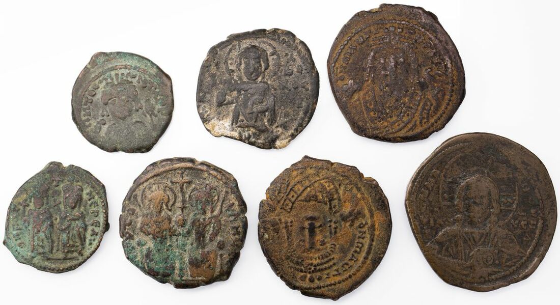 Byzantine Empire, A Selection of Bronze (7): i) Anonymous, 40 Nummi, Christ facing rev. Legend in four lines, 12.44g (SB, 1813) flattened, about fine; Justin II (6): ii) with Sophia, AE Follis, Antioch (Theopoulis) 3rd officina, Year 8 = 572/3, Justin and Sophia, each holding a scepter, enthroned facing, both nimbate, holding large globus cruciger between them rev. Large