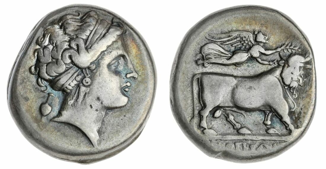 Campania, Neapolis, AR Didrachm, c. 300-275 BC, Diademed head of nymph right, amphora behind rev. Man-headed bull walking right, above Nike flying right, crowning with wreath,