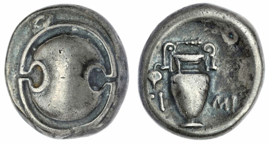 Boeotia, Thebes, AR Stater, Magistrate Timi-, 378-338 BC, Boeotian shield rev. Amphora with club right above, ivy-leaf on left handle,