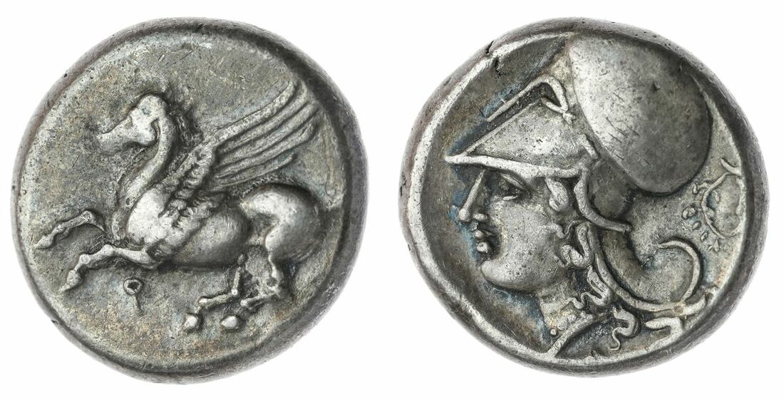 Corinthia, Corinth, AR Didrachm, c. 345-307 BC, Pegasos flying left with koppa below, rev. Head of Athena left, wearing Corinthian helmet, wreath behind, 8.48g, (Pegasi, 403; BCD Corinth, 116; HGC 4, 1848) Lovely portrait, lustrous and toned, slightly softened obverse but nonetheless good very fine