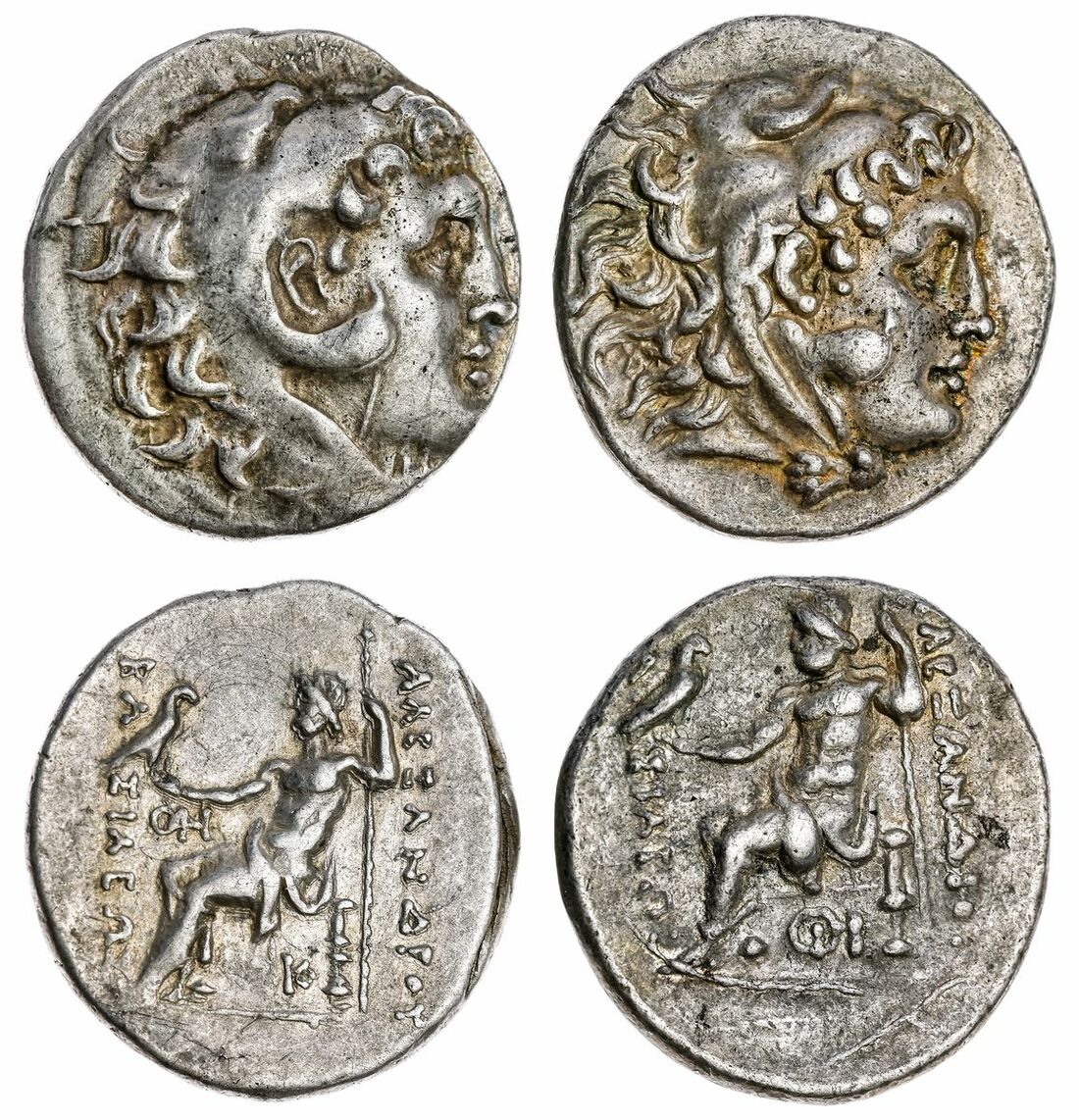 The 'Kyrios' Collection | a Pair of Tetradrachmae of Alexander III, 'The Great' (336-323 BC), uncertain mints (2): i) Head of Herakles left, clad in lion's skin rev. BASILEOS ALEXANDROY, Zeus Aetophoros seated left holding vertical spear, monogram below throne, 16.84g well centred strike, very fine obverse, near very fine reverse; ii) similar types, monogram under throne and in inner left field, 16.99gnear very fine (2)