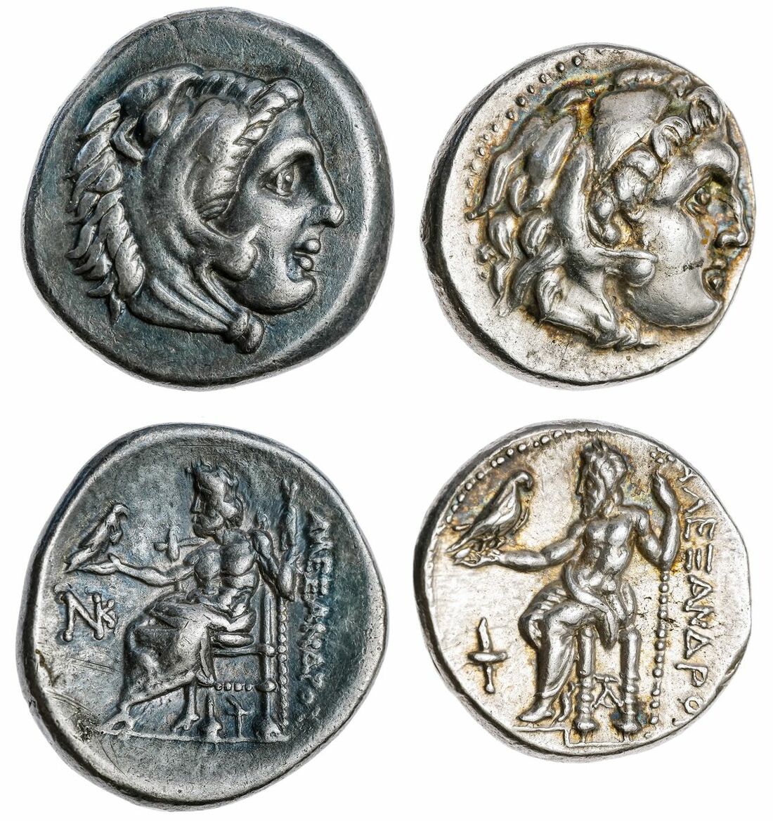 The 'Kyrios' Collection | Kingdom of Macedon, Alexander III, 'The Great' (336 - 323 BC) AR Drachm (2): i) Sardes, Head of Herakles right, clad in lion's skin rev. ALEXANDROY Zeus Aetophoros holding vertical sceptre in left hand, torch below throne, monogram in left field, 4.28g (Price 2580) well centred with a lovely tone, good very fine ii) Another, as before, with monogram below throne and torch in left field, 4.26g (Price 2637) bright and finely detailed, good very fine; (2)