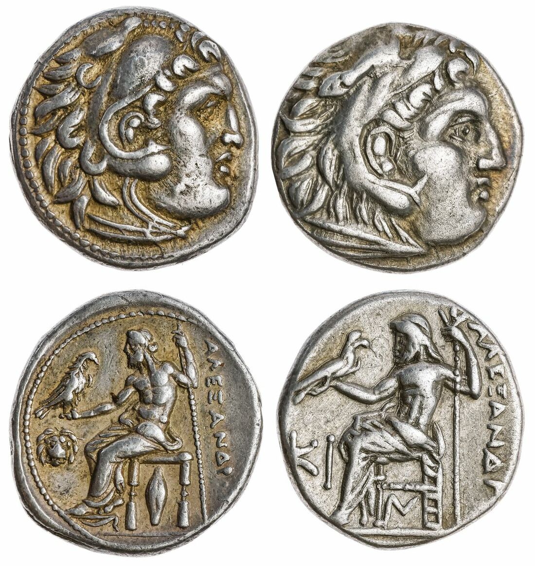 The 'Kyrios' Collection | Kingdom of Macedon, Alexander III, 'The Great' (336-323 BC), a pair of Drachmae (2): AR Drachm, Lampsacus c. 306-301 BC struck under Antigonos I Monopthalamos (306-301 BC), Head of Herakles right, clad in lion's skin rev. ALEXANDROY Zeus Aetophoros holding vertical sceptre in left hand, ME ligate below throne, KI in left field, 4.13g (Price 1405) well centred, lustorus, good very fine; ii) AR Drachm, uncertain mint in Asia Minor c. 323-280 BC, Head of Herakles right, clad in lion's skin rev. ALEXANDROY Zeus Aetophoros holding vertical sceptre in left hand, barley grain below throne, head of lion facing in left field, 4.31g (Price 2701) residually lustrous, well centred, very fine (2)